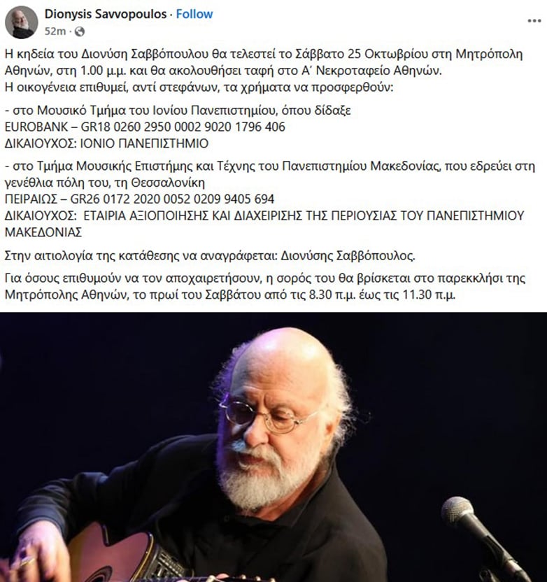 Η κηδεία του τραγουδοποιού Διονύση Σαββόπουλου, που πέθανε την περασμένη Τρίτη σε ηλικία 81 ετών, θα τελεστεί το Σάββατο 25 Οκτωβρίου στη Μητρόπολη Αθηνών, στη 1 το μεσημέρι, και θα ακολουθήσει ταφή στο Α’ Νεκροταφείο Αθηνών, σύμφωνα με ανάρτηση της οικογένειας του τραγουδοποιού στα κοινωνικά δίκτυα.