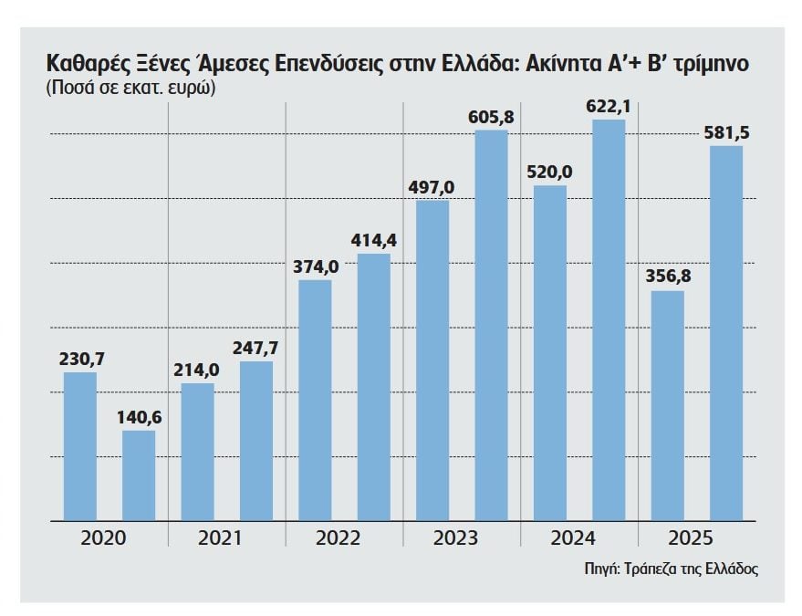 Έπειτα από μια πενταετία διαρκούς ανόδου των επενδύσεων από ξένους υπηκόους και βάσει των στοιχείων της Τράπεζας της Ελλάδος το πρώτο εξάμηνο του 2025, σε σχέση με το αντίστοιχο περσινό διάστημα, σημειώνεται θεαματική μείωση, 17,8%, (938,3 εκατ. έναντι 1.142,1 εκατ. ευρώ).