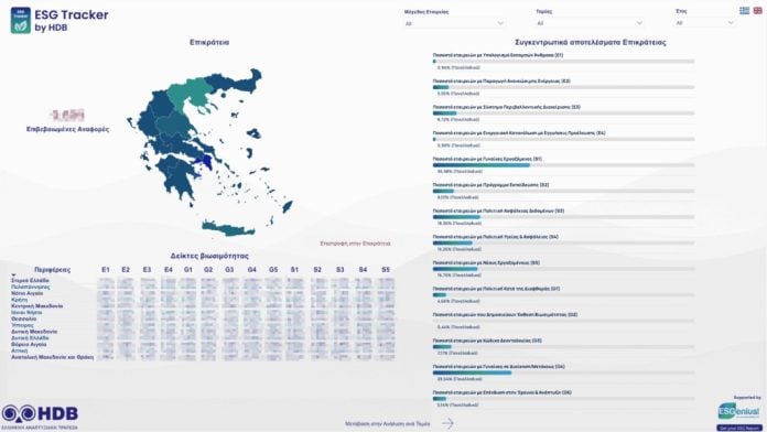 Παράλληλα, η ΕΑΤ παρουσιάζει τον πανελλαδικό διαδραστικό χάρτη του ESG Tracker by HDB, τον πρώτο και μοναδικό διαδραστικό ESG χάρτη βιωσιμότητας των ΜμΕ στην Ελλάδα, βασισμένο σε πραγματικά δεδομένα ανά τομέα δραστηριότητας, περιφέρεια και μέγεθος επιχείρησης. Ο χάρτης αποτελεί ένα εργαλείο στρατηγικής πρόβλεψης υψηλής προστιθέμενης αξίας, το οποίο μόνο η Ελληνική Αναπτυξιακή Τράπεζα διαθέτει σε αυτή την έκταση και μπορεί να αξιοποιηθεί για το σχεδιασμό στοχευμένων πολιτικών βιώσιμης ανάπτυξης.