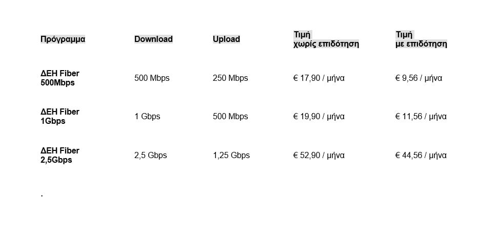 Οπως αναφέρεται σε σχετική ανακοίνωση «η ΔΕΗ θέτει σε ισχύ νέα, μειωμένα τιμολόγια για τους δικαιούχους της δράσης σε όλα τα προγράμματα ΔΕΗ Fiber. Οι τιμές ξεκινούν από €9,56 το μήνα για τα 500 Mbps».
