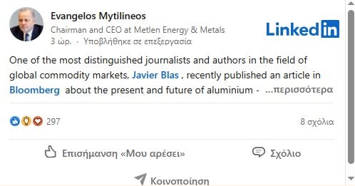 «Ένας από τους γνωστότερους δημοσιογράφους και συγγραφείς στον χώρο των παγκόσμιων αγορών εμπορευμάτων, ο Javier Blas, έγραψε στο Bloomberg ένα άρθρο σχετικά με το παρόν και το μέλλον του Αλουμινίου, ένα μέταλλο με λαμπρό παρόν και μέλλον.
