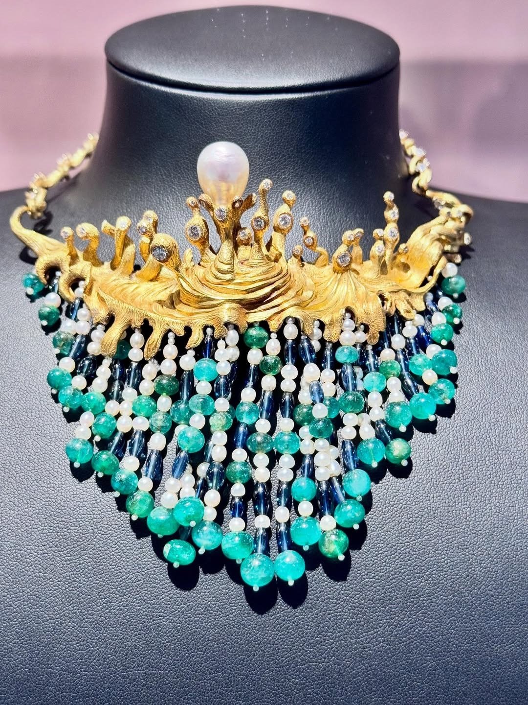 Το έργο φέρει τον τίτλο Swirling Sea Necklace (Κολιέ Στροβιλιζόμενη Θάλασσα) καθώς ο χρυσός 18 καρατίων σκαλίστηκε σε ένα κυματιστό κυκλικό δαχτυλίδι με ένθετα διαμάντια και ένα μεγάλο μαργαριτάρι. Περιλαμβάνει επίσης ζαφείρι και σμαραγδένιες χάντρες. Μαζί, οι πέτρες θυμίζουν κύματα που ανεβαίνουν και σπάνε σε μια χρυσή ακτή. Tο κολιέ ζυγίζει 156 γραμμάρια.