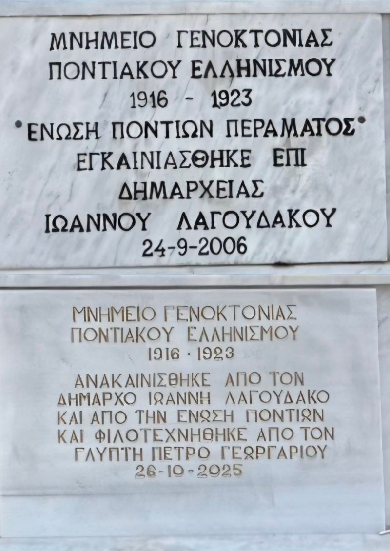 Πιστοί στο χρέος για την τιμή των Ποντίων ηρώων και ευλαβείς για τις ποντιακές ρίζες του ελληνισμού και πολλών οικογενειών του Περάματος, ο δήμαρχος Γιάννης Λαγουδάκος και η Ένωση Ποντίων Περάματος «Ο Πόντος», εγκαινίασαν σε έντονα συγκινησιακό κλίμα την ανακαινισμένη Πλατεία Ποντίων με τα αποκαλυπτήρια του νέου μεγαλειώδους μνημείου του Ποντιακού Ελληνισμού, απαντώντας σε μια υπόσχεση που εκκρεμούσε να πραγματοποιηθεί εδώ και 13 χρόνια από πλευράς του Δήμου Περάματος.