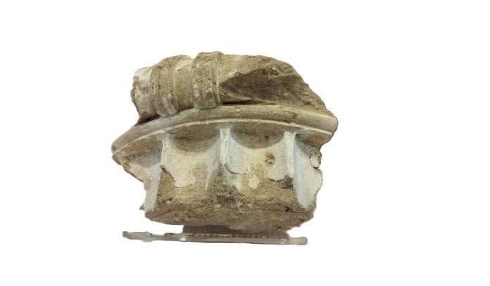 Πρόκειται για θραύσμα ιωνικού κιονοκράνου, κατασκευασμένο από ασβεστόλιθο, το οποίο σώζει κατά τόπους επίχρισμα. Έχει μέγιστες σωζόμενες διαστάσεις: 24 εκ. (ύψος) επί 33,5 εκ. (πλάτος) και εμφανίζει τεχνοτροπικές ομοιότητες με δημοσιευμένα ιωνικά κιονόκρανα από τον χώρο της Αρχαίας Ολυμπίας.