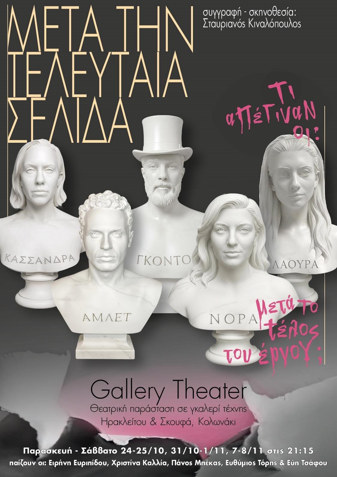 «Το «Μετά την τελευταία σελίδα» αποτελεί μια θεατρική πρόταση που δεν έχει ξαναγίνει στην Ελλάδα! Το κοινό επισκέπτεται το υπέροχο νεοκλασικό κτίριο του Theater Galleryστο Κολωνάκι και ξεναγείται σε 5 διαφορετικά δωμάτια.