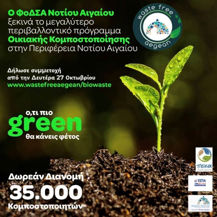 Ό,τι πιο green θα κάνεις φέτος ξεκινά την Δευτέρα 27 Οκτωβρίου 2025, στις 09:00, όπου οι πολίτες της Περιφέρειας Νοτίου Αιγαίου μπορούν να δηλώσουν συμμετοχή στο μεγαλύτερο πρόγραμμα οικιακής κομποστοποίησης και να διεκδικήσουν την απόκτηση του δικού τους οικιακού κομποστοποιητή εντελώς δωρεάν.