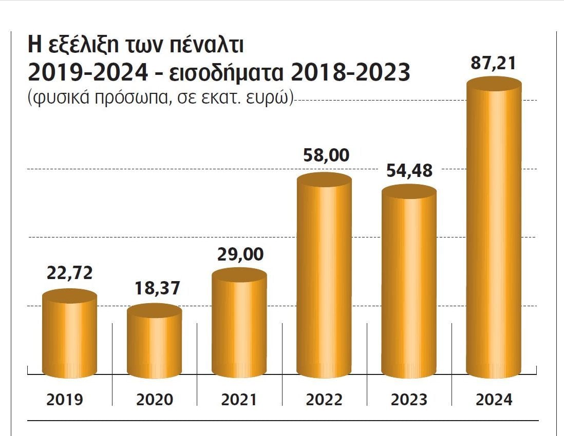 Αυτή ήταν λοιπόν και η βασική αιτία για την αύξηση του συνολικού ποσού των καταλογισθέντων «πέναλτι» κατά 60% -από τα 55,48 στα 87,21 εκατ. ευρώ- μεταξύ του 2023 και του 2024.