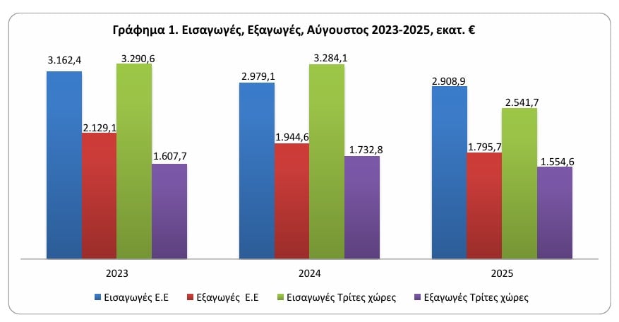 Σε ό,τι αφορά τις εξαγωγές, η συνολική αξία τους μειώθηκε στα 3,350 δισ. ευρώ, έναντι 3,677 δισ. ευρώ τον αντίστοιχο περυσινό μήνα, παρουσιάζοντας μείωση 8,9%. Σημειώνεται ότι η αντίστοιχη αξία χωρίς τα πετρελαιοειδή τον Αύγουστο 2025 παρουσίασε μείωση κατά 181,5 εκατ. ευρώ δηλαδή 7,1% και η αντίστοιχη αξία χωρίς τα πετρελαιοειδή και τα πλοία κατά τον Αύγουστο του 2025 παρουσίασε μείωση κατά 183,5 εκατ. ευρώ, δηλαδή 7,3%, σε σχέση με τον Αύγουστο του 2024.