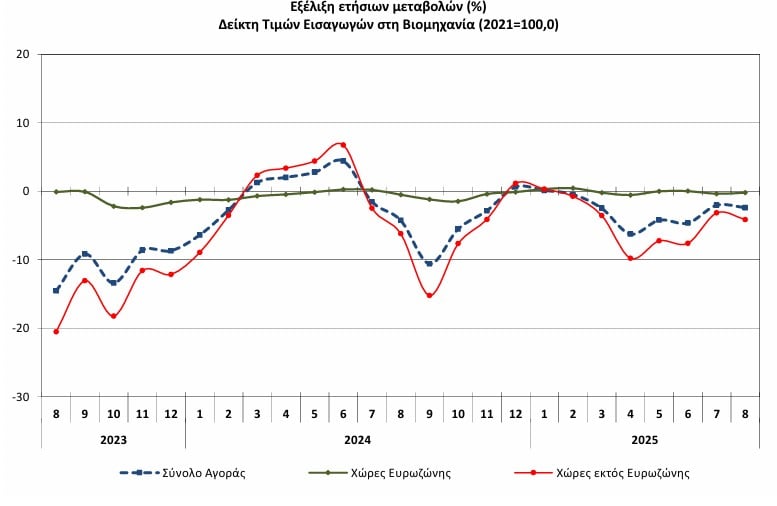 Μείωση καταγράφηκε και σε μηνιαία βάση, με τον Γενικό Δείκτη τον Αύγουστο του 2025 να καταγράφει μείωση 1,7% σε σύγκριση με τον δείκτη Ιουλίου 2025, έναντι μείωσης 1,4% που σημειώθηκε κατά την αντίστοιχη σύγκριση των δεικτών του έτους 2024.