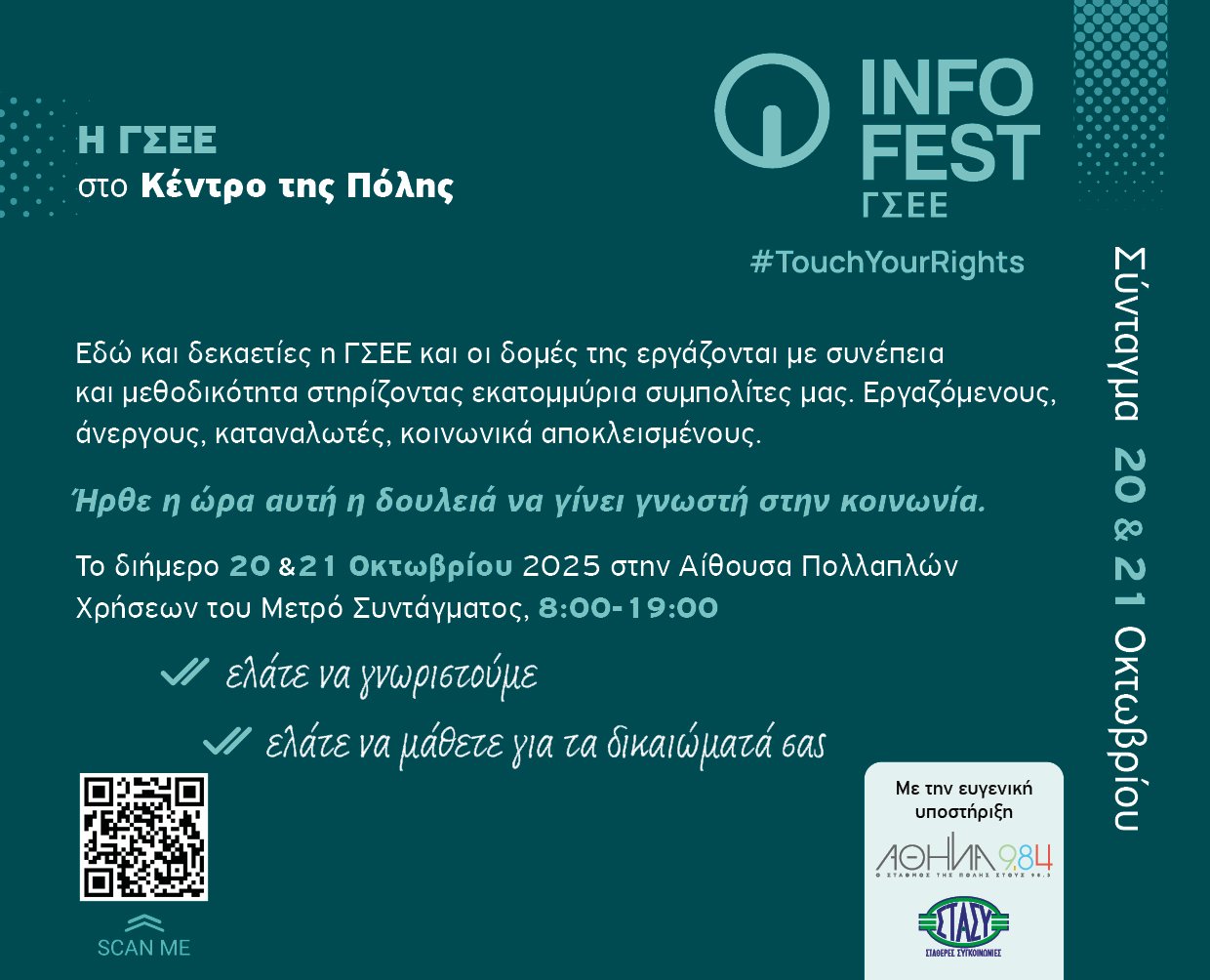 Η ΓΣΕΕ φέρνει την ενημέρωση για τα εργασιακά και κοινωνικά δικαιώματα στον πιο πολυσύχναστο κόμβο της Αθήνας, με το INFO FEST 2025, μια διήμερη δράση που θα πραγματοποιηθεί στις 20 και 21 Οκτωβρίου, από τις 08:00 έως τις 19:00 στο Μετρό Συντάγματος, στην αίθουσα πολλαπλών χρήσεων.