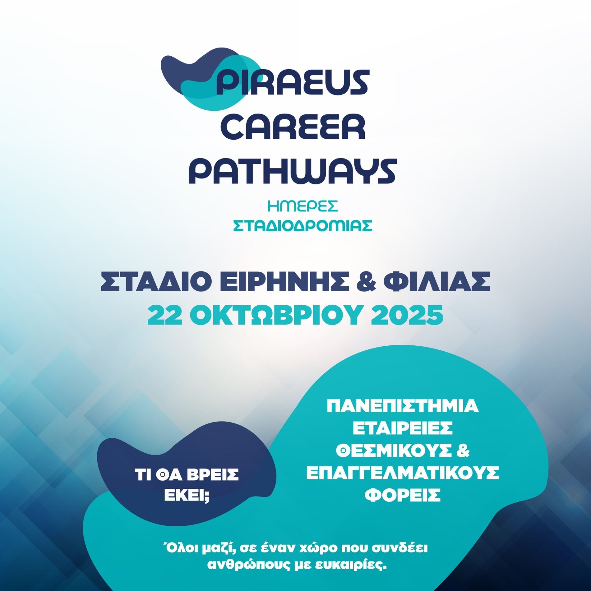 Σε ένα ζωντανό πεδίο συνάντησης εκπαίδευσης, επιχειρηματικότητας και καινοτομίας, μέσα από το 1ο «Piraeus Career Pathways 2025», που συνδιοργανώνει ο Εμπορικός Σύλλογος Πειραιώς με το Στάδιο Ειρήνης & Φιλίας, στο ΣΕΦ, μετατρέπεται στις 22 Οκτωβρίου 2025 ο Πειραιάς.
