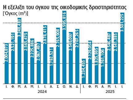 Τον Ιούλιο του 2025 η ιδιωτική οικοδομική δραστηριότητα κινήθηκε στα ίδια θετικά επίπεδα: οι 3.118 άδειες του Ιουλίου αντιστοιχούν σε άνοδο 13%, με την επιφάνεια να αυξάνεται κατά 12,5% και τον όγκο κατά 21,6%. Οι υψηλοί ρυθμοί ανόδου στον όγκο καταδεικνύουν ότι εκδίδονται άδειες οικοδομών με μεγαλύτερο κατασκευαστικό αποτύπωμα, ενώ σε αρκετές περιφέρειες -όπως η Στερεά Ελλάδα και η Κρήτη- καταγράφονται εντυπωσιακοί ρυθμοί αύξησης στις επιμέρους μεταβλητές.