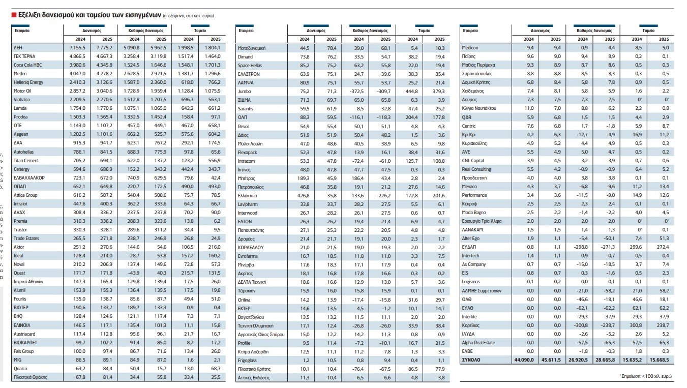 Τώρα, αν αφαιρέσουμε από τον συνολικό δανεισμό τα ταμειακά διαθέσιμα, τις δεσμευμένες καταθέσεις και τα άμεσα ρευστοποιήσιμα περιουσιακά στοιχεία, βλέπουμε ότι ο λεγόμενος καθαρός δανεισμός των 114 εισηγμένων ανέρχεται στο αρκετά διαχειρίσιμο ποσό των 28,665 δισ. ευρώ, το οποίο, βέβαια, αποδεικνύεται «φουσκωμένο» κατά +6,4% ή κατά 1,7 δισ. ευρώ σε σχέση με τον κλείσιμο της οικονομικής χρήσης του 2024.