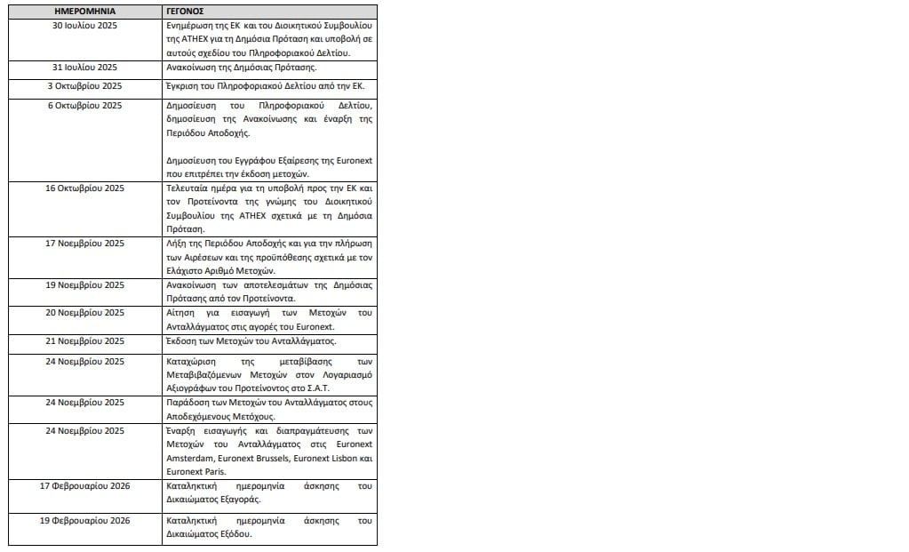 Η δημόσια πρόταση γίνεται με ανταλλαγή μετοχών και όχι με μετρητά, με τη σχέση να διαμορφώνεται σε 0,05 μετοχές της Euronext για κάθε 1 μετοχή της ΕΧΑΕ.