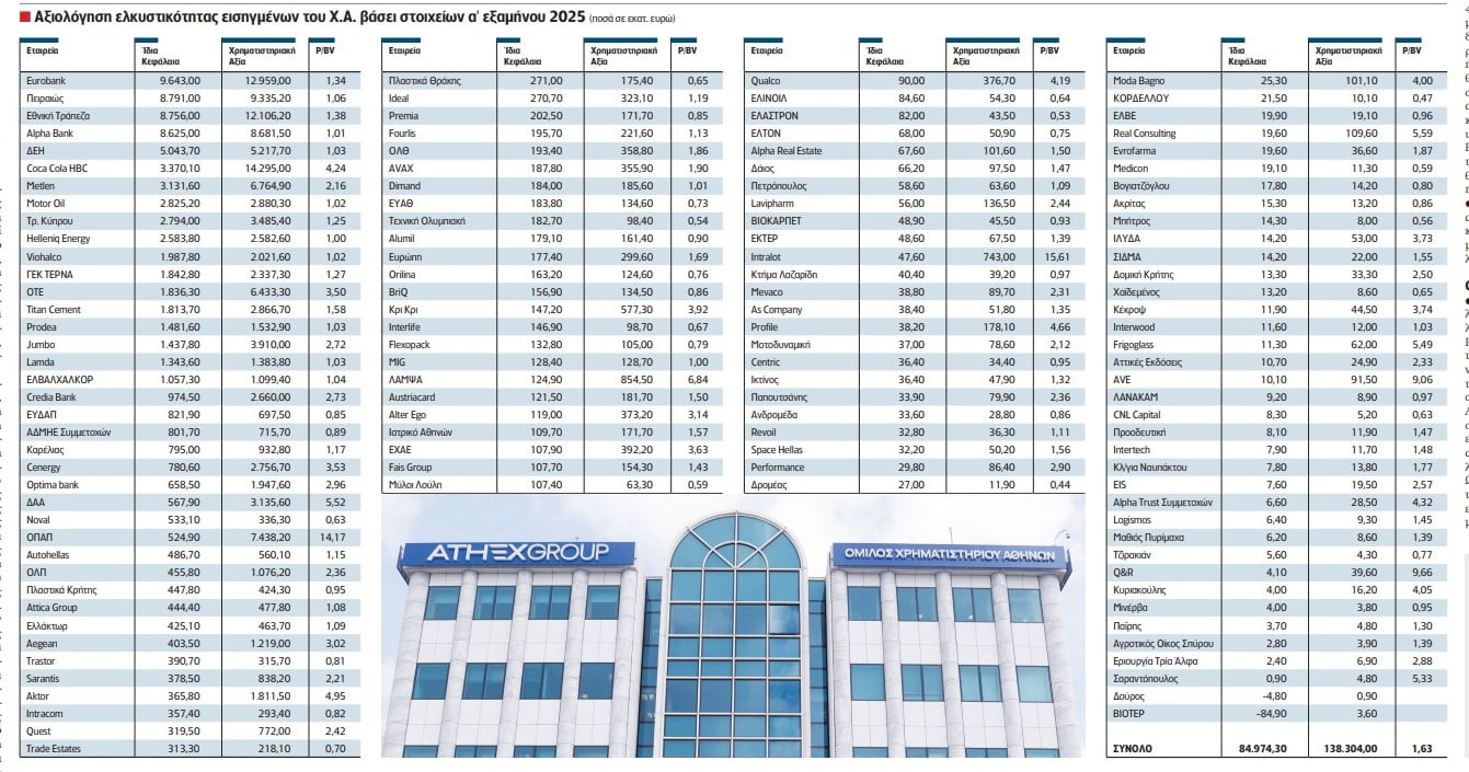 - Με την αθροιστική αξία των ιδίων κεφαλαίων, τα οποία αποδίδονται στους μετόχους της μητρικής, να διαμορφώνεται σε 84,974 δισ. ευρώ για το α’ εξάμηνο του 2025, και την κεφαλαιοποίηση να καθορίζεται σε 138,304 δισ. ευρώ με βάση τις τιμές των μετοχών στη συνεδρίαση της 3ης Οκτωβρίου, ο μέσος δείκτης P/BV του Χ.Α. ανέρχεται στο 1,63x.