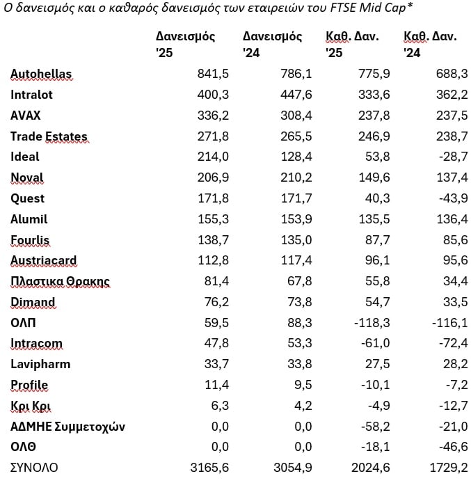 Αξίζει να σημειωθεί, βέβαια, ότι στον FTSE Mid Cap υπάρχουν και δυο… τελείως αδάνειστες εισηγμένες, με τις υποχρεώσεις σε δάνεια και μισθώσεις των ΑΔΜΗΕ Συμμετοχών και ΟΛΘ να είναι τελείως μηδενικές.