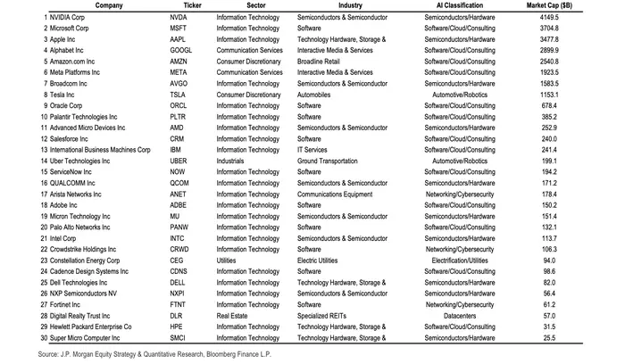 Η JPMorgan είναι αισιόδοξη για τις μετοχές της τεχνητής νοημοσύνης, αν και οι αναλυτές της σημείωσαν ότι πιθανή διόρθωση στον τομέα θα εξαφάνιζε ένα σημαντικό μέρος των πρόσφατων κερδών. «Εάν οι μετοχές τεχνητής νοημοσύνης αντιπροσωπεύουν πλέον το 44% της κεφαλαιοποίησης της αγοράς, τότε μια πτώση της αξίας τους κατά 10% θα μείωνε τον πλούτο των νοικοκυριών κατά 2,7 τρισ. δολάρια και την κατανάλωση κατά περίπου 95 δισ. δολάρια (0,45%)», πρόσθεσαν οι αναλυτές.