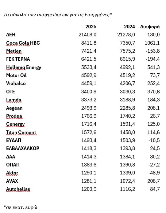 Όσον αφορά τις αποκλίσεις σε σχέση με την περσινή σεζόν, η μεγαλύτερη άνοδος ανήκει στην Coca Cola HBC με 1 δισ. ευρώ, ενώ έπονται οι Helleniq Energy με 541 εκατ. ευρώ, ο ΟΤΕ με 370 εκατ. ευρώ, η Viohalco με 252 εκατ. ευρώ και οι AVAX – Aegean Airlines με 208 εκατ. ευρώ. Από την άλλη πλευρά, τη μεγαλύτερη μείωση στο παθητικό παρουσιάζουν οι ΓΕΚ ΤΕΡΝΑ και Metlen με κάμψη 194 και 153 εκατ. ευρώ, αντίστοιχα.