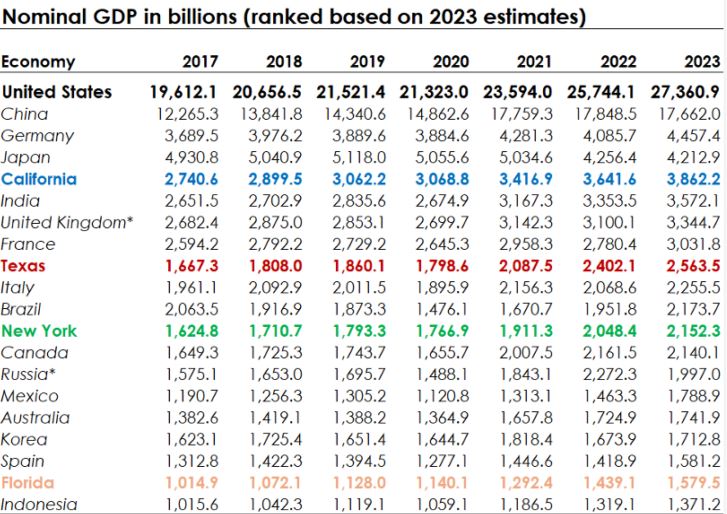 Εάν η Καλιφόρνια ήταν αυτόνομο κράτος θα ήταν η πέμπτη οικονομία του πλανήτη, πίσω από τις ΗΠΑ, την Κίνα, τη Γερμανία και την Ιαπωνία (πίνακας), με βάση δε στοιχεία του 2024 η Πολιτεία είναι η 4η μεγαλύτερη οικονομία του πλανήτη με ακαθάριστο προϊόν άνω των 4 τρισεκατομμυρίων δολαρίων.