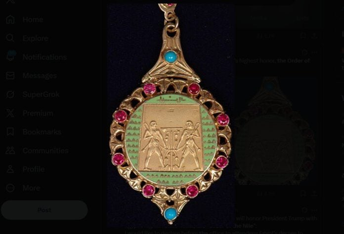Ο Αμερικανός Πρόεδρος έλαβε το Παράσημο του Νείλου, γνωστό και ως Περιδέραιο του Νείλου, σε αναγνώριση της συμβολής του στην υποστήριξη των στρατηγικών σχέσεων μεταξύ των δύο χωρών, σύμφωνα με ανακοίνωση της αιγυπτιακής προεδρίας.