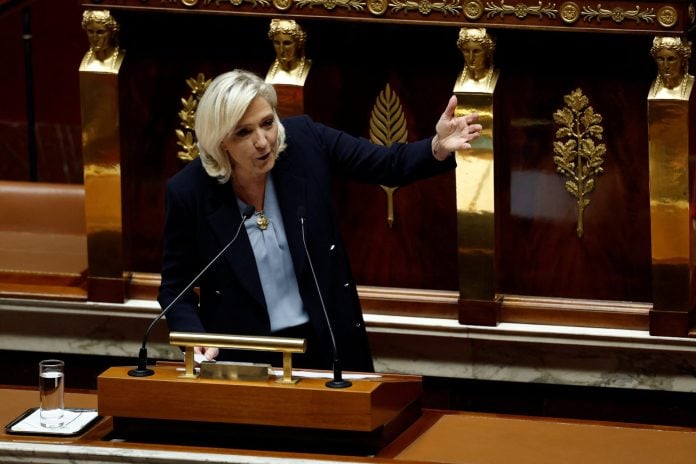 Η Μαρίν Λεπέν, επικεφαλής της ΚΟ του Rassemblement National μίλησε στη Βουλή για να παρουσιάσει την πρόταση μομφής της. Καταγγέλλοντας τη «μετριότητα» της δημόσιας συζήτησης και το «αξιοθρήνητο θέαμα» που προσέφεραν οι Μακρονιστές μετά τις αλλεπάλληλες πτώσεις των κυβερνήσεων, η Λεπέν αναφέρθηκε στο ζήτημα του προϋπολογισμού.