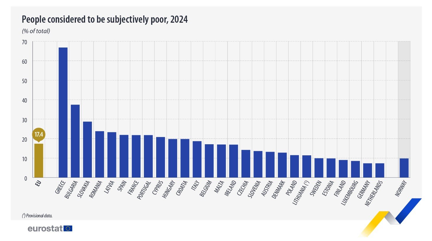 Η εικόνα της φτώχειας στην Ευρωπαϊκή Ένωση δείχνει σημάδια βελτίωσης, σύμφωνα με τα τελευταία στοιχεία της Eurostat. Ο δείκτης «υποκειμενικής φτώχειας» — που αποτυπώνει το πώς αντιλαμβάνονται οι πολίτες την οικονομική τους κατάσταση — μειώθηκε το 2024 στο 17,4%, από 19,1% που είχε καταγραφεί το 2023. Παρ’ όλα αυτά η χώρα μας παραμένει πρώτη στην ΕΕ με περισσότερους από τους μισούς πολίτες να δηλώνουν πως έχουν οικονομικές δυσκολίες.