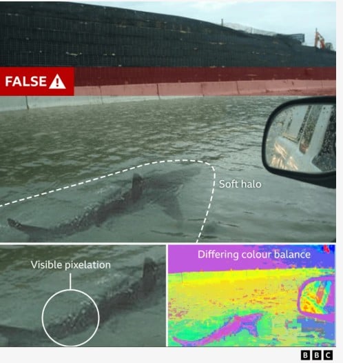 Σε ένα από τα fake αυτά στιγμιότυπα, δύο πτερύγια καρχαρία ξεπροβάλλουν από τα οργισμένα νερά της πλημμύρας και «τρέχουν» προς μια παραθαλάσσια κοινότητα. Σε ένα άλλο, δύο καρχαρίες εμφανίζονται να κολυμπούν σε μια πισίνα.
