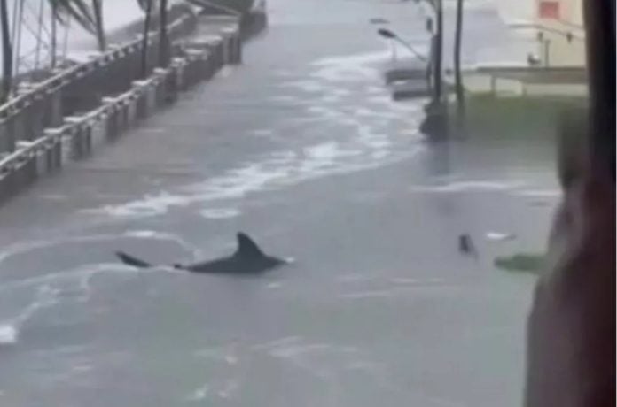 Ένα βίντεο, που έχει προβληθεί μισό εκατομμύριο φορές στο TikTok, δείχνει μια γυναίκα σε ένα μπαλκόνι να βιντεοσκοπεί δύο καρχαρίες που κολυμπούν σε πλημμυρισμένους δρόμους.