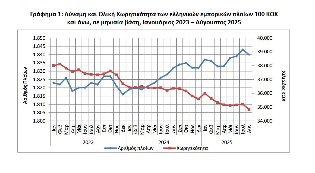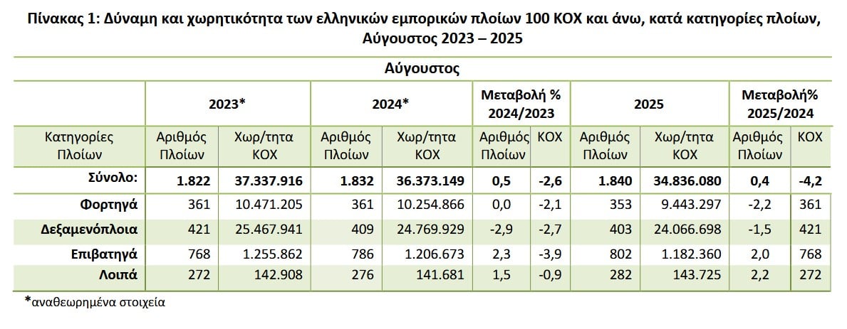 Επίσης, σύμφωνα με την ΕΛΣΤΑΤ, η ολική χωρητικότητα του ελληνικού εμπορικού στόλου (πλοία 100 κόρων και άνω) ανήλθε σε 34.836.080 κόρους και παρουσίασε μείωση 4,2% τον Αύγουστο 2025 σε σύγκριση με την αντίστοιχη χωρητικότητα του Αυγούστου 2024, έναντι μείωσης 2,6% που είχε σημειωθεί κατά την αντίστοιχη σύγκριση του Αυγούστου 2024 προς τον Αύγουστο 2023.