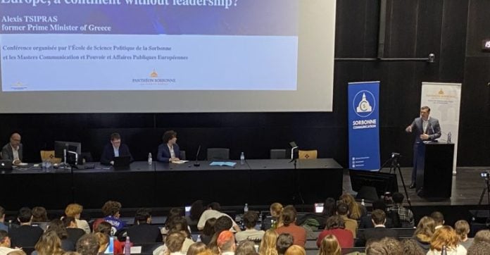 «Ευρώπη: Μια ήπειρος χωρίς ηγεσία;» ήταν το κεντρικό θέμα της εκδήλωσης όπου μίλησε ο πρώην πρωθυπουργός Αλέξης Τσίπρας στο ιστορικό πανεπιστήμιο της Γαλλίας Paris 1 Panthéon-Sorbonne. Η εκδήλωση διοργανώθηκε από την Σχολή Πολιτικών Επιστημών και το μεταπτυχιακό τμήμα Επικοινωνίας, Εξουσίας και Δημοσίων Ευρωπαικών Υποθέσεων.