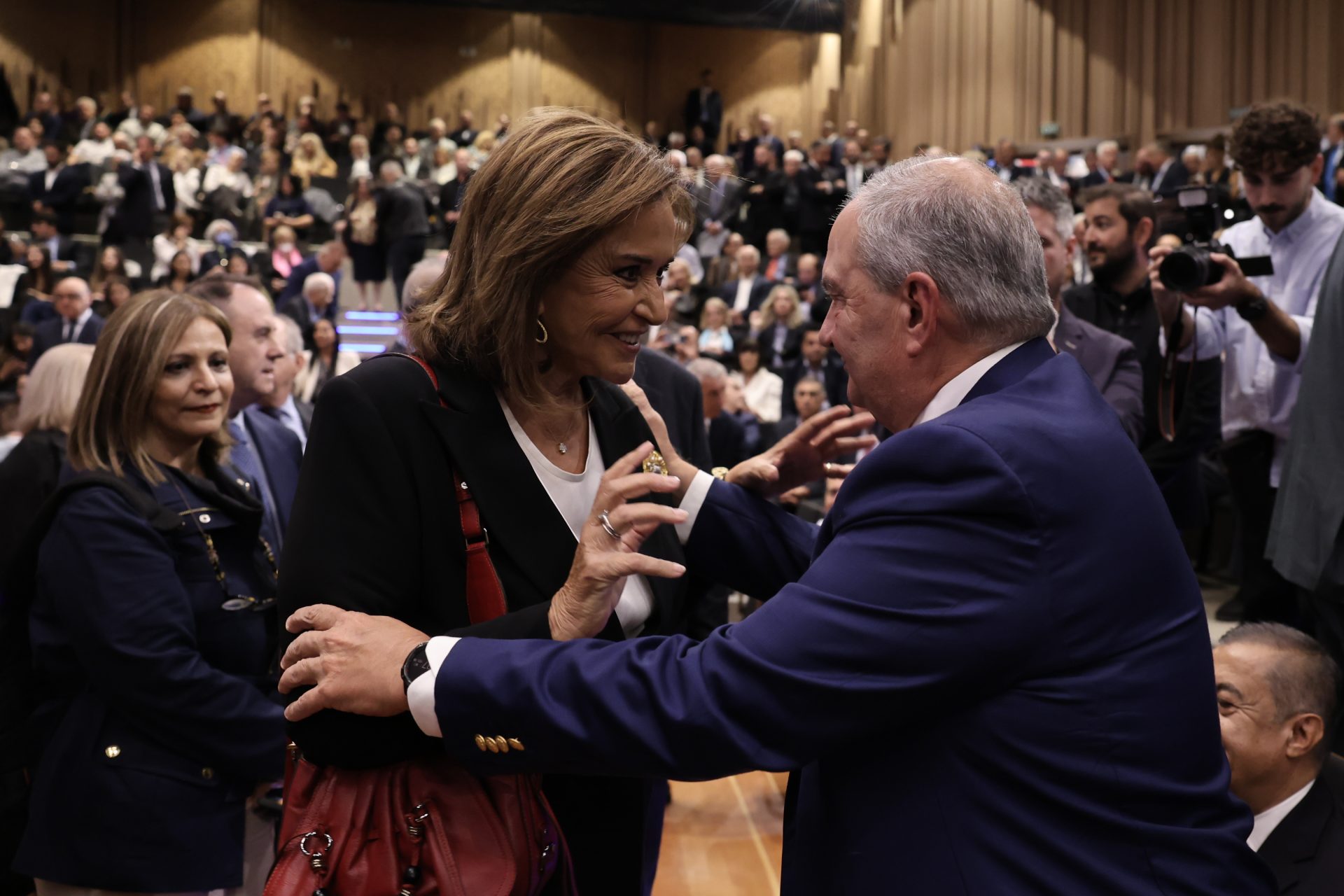 Κυριάκος Μητσοτάκης και Κώστας Καραμανλής, αντήλλαξαν χειραψία και μερικές κουβέντες λίγο προτού πάρουν τις θέσεις τους στη μπροστινή σειρά του αμφιθεάτρου.