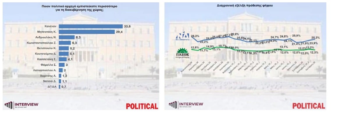 Στην ερώτηση «ποιον πολιτικό αρχηγό εμπιστεύεστε περισσότερο για τη διακυβέρνηση της χώρας», το 33,6% απαντά «κανέναν». Εν συνεχεία, ο πρωθυπουργός έρχεται πρώτος μεταξύ των υπόλοιπων πολιτικών αρχηγών με ποσοστό 29,4% και ακολουθούν οι Νίκος Ανδρουλάκης με 8,3%, Ζωή Κωνσταντοπούλου με 6,3%, Κυριάκος Βελόπουλος με 5,2%, Δημήτρης Κουτσούμπας με 5,1%, Στέφανος Κασσελάκης με 4,1%, Σωκράτης Φάμελλος με 3%, Αφροδίτη Λατινοπούλου με 2%, Αλέξης Χαρίτσης με 1,2%, Δημήτρης Νατσιός με 1,1%, ενώ 0,17% απαντά «δεν ξέρω/δεν απαντώ».