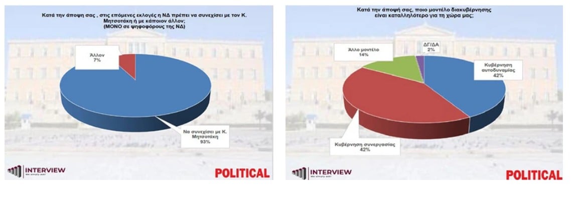 Στη δημοσκόπηση δίνεται επίσης απάντηση στα σενάρια περί αλλαγής ηγεσίας στη ΝΔ, με ποσοστό 93% να απαντά ότι η κυβερνητική παράταξη πρέπει να συνεχίσει με τον Κυριάκο Μητσοτάκη στις επόμενες εκλογές, έναντι μόλις 7% που απαντά «με άλλον».