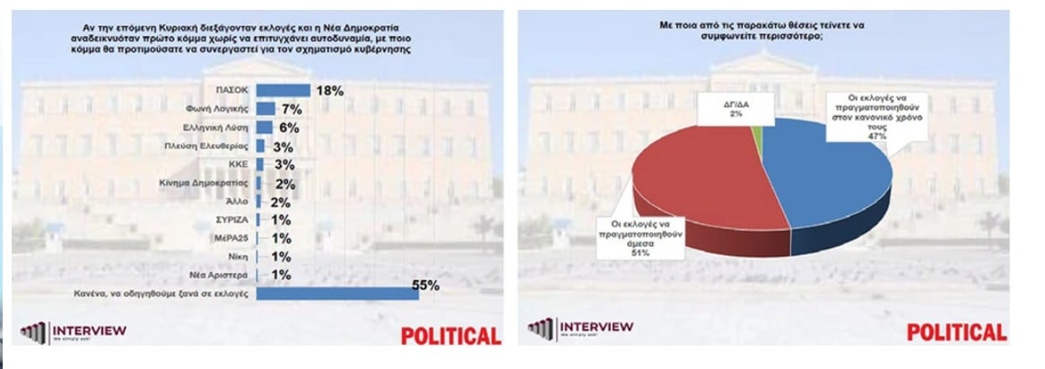 Στην ερώτηση «αν την επόμενη Κυριακή διεξάγονταν εκλογές και η ΝΔ αναδεικνυόταν πρώτο κόμμα χωρίς να επιτυγχάνει αυτοδυναμία, με ποιο κόμμα θα προτιμούσατε να συνεργαστεί για τον σχηματισμό κυβέρνησης;», το 18% απαντά με το ΠΑΣΟΚ, το 7% με τη Φωνή Λογικής, το 6% με την Ελληνική Λύση, το 3% με την Πλεύση Ελευθερίας, το 3% με το ΚΚΕ, το 2% με το Κίνημα Δημοκρατίας, «άλλο» απαντά ένα 2%, με τον ΣΥΡΙΖΑ 1%, με το ΜέΡΑ25 1%, με τη Νίκη 1%, με τη Νέα Αριστερά 1%, ενώ το 55% ζήτησε να οδηγηθούμε ξανά σε εκλογές.