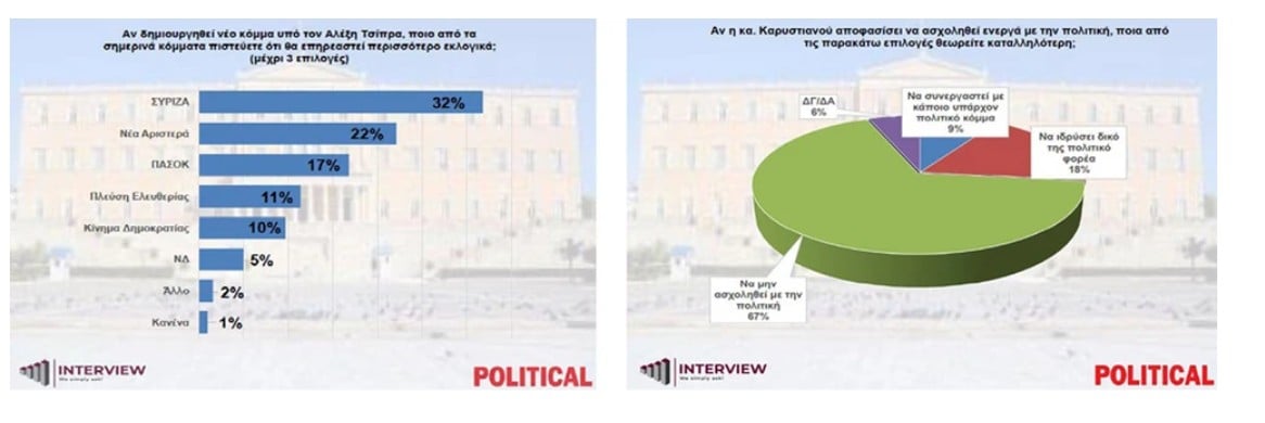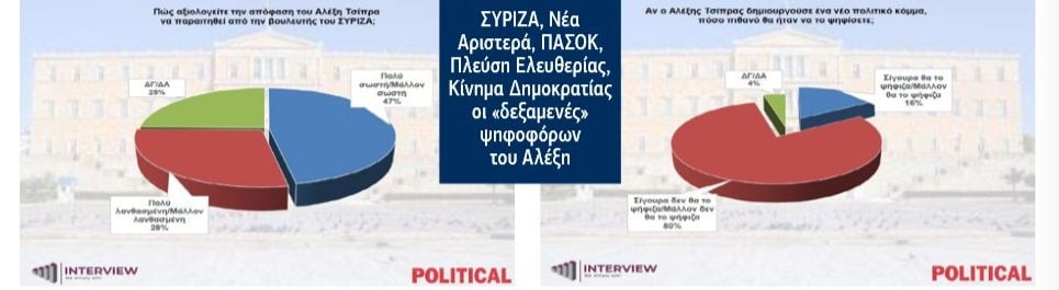Στη έρευνα της Interview, για λογαριασμό της «Political», η οποία διενεργήθηκε από 1 έως 8 Οκτωβρίου, περίπου ένας στους πέντε απαντά ότι θα ψήφιζε ένα νέο κόμμα υπό τον Αλέξη Τσίπρα.