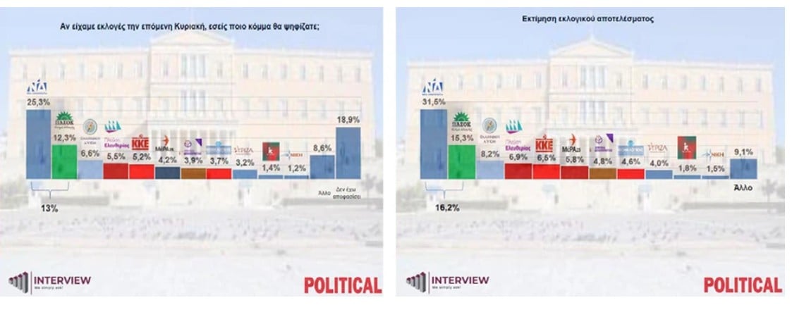 Στην εκτίμηση εκλογικού αποτελέσματος, η ΝΔ εξασφαλίζει 31,5%, το ΠΑΣΟΚ 15,3%, η Ελληνική Λύση 8,2%, η Πλεύση Ελευθερίας 6,9%, το ΚΚΕ 6,5%, το ΜέΡΑ25 5,8%, το Κίνημα Δημοκρατίας 4,8%, η Φωνή Λογικής 4,6%, ο ΣΥΡΙΖΑ 4%, η Νέα Αριστερά 1,8%, η Νίκη 1,5%, ενώ ποσοστό 9,1% απαντά «άλλο».