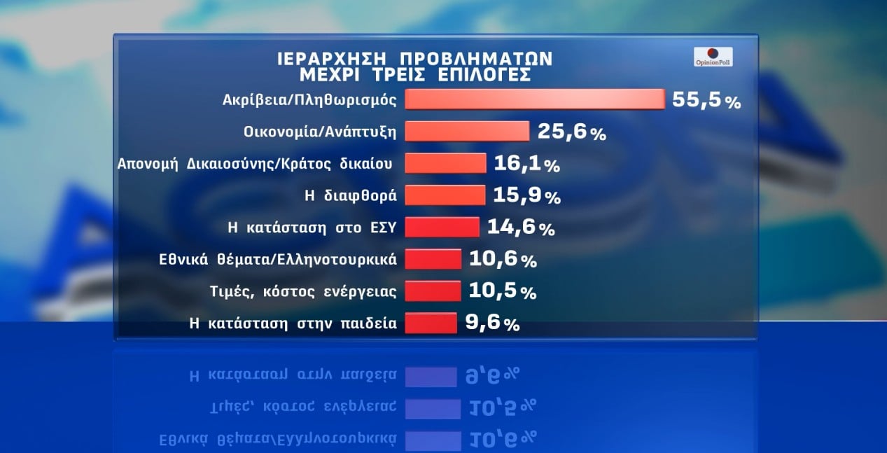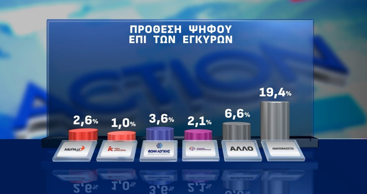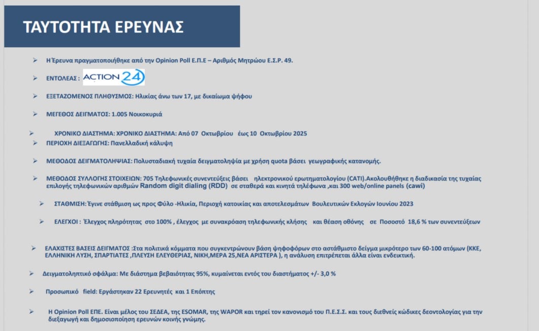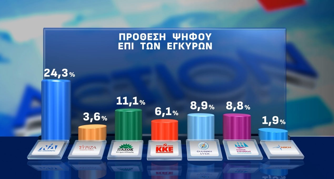 Στην πρόθεση ψήφου επί των εγκύρων, σύμφωνα με την έρευνα της Opinion Poll, για λογαριασμό του Action 24, η ΝΔ είναι στο 24,3%, το ΠΑΣΟΚ 11,1%, η Ελληνική Λύση 8,9%, η Πλεύση Ελευθερίας 8,8%, το ΚΚΕ 6,1%, ο ΣΥΡΙΖΑ 3,6%, η Φωνή Λογικής 3,6%, το ΜέΡΑ25 2,6%, το Κίνημα Δημοκρατίας 2,1%, η Νίκη 1,9%, η Νέα Αριστερά 1%, Άλλο Κόμμα 6,6%, ενώ το ποσοστό των αναποφάσιστων ανέρχεται στο 19,4%.
