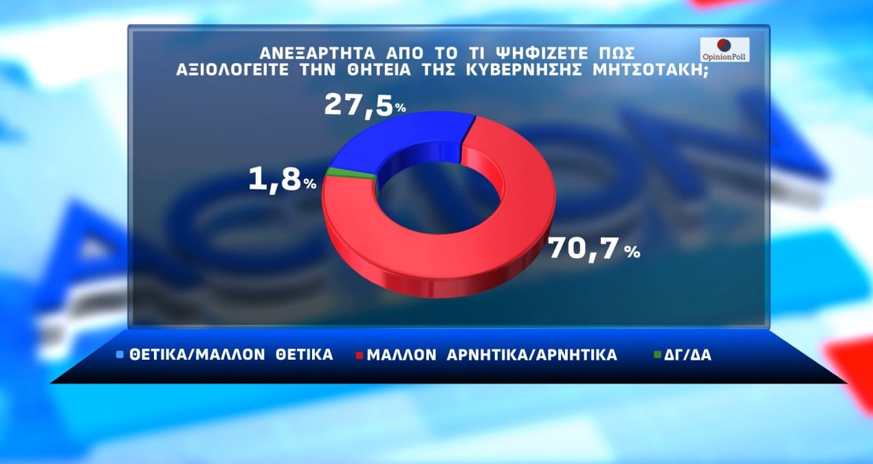 Σε ερώτηση για πώς αξιολογούν την κυβέρνηση του Κυριάκου Μητσοτάκη, ανεξάρτητα από το τι ψηφίζουν, το 70,7% την αξιολογεί «μάλλον αρνητικά/αρνητικά», το 27,5% «θετικά μάλλον θετικά», ενώ το 1,8% απαντά «ΔΓ/ΔΑ».