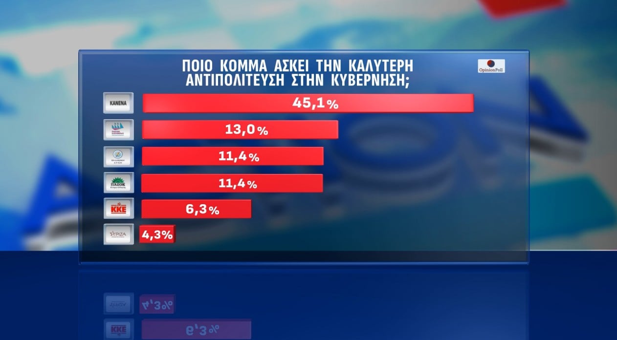 Σύμφωνα με την έρευνα, το 45,1% των ερωτηθέντων πιστεύει πως κανένα από τα κόμματα της αντιπολίτευσης δεν επιτελεί ορθά τα αντιπολιτευτικά του καθήκοντα.