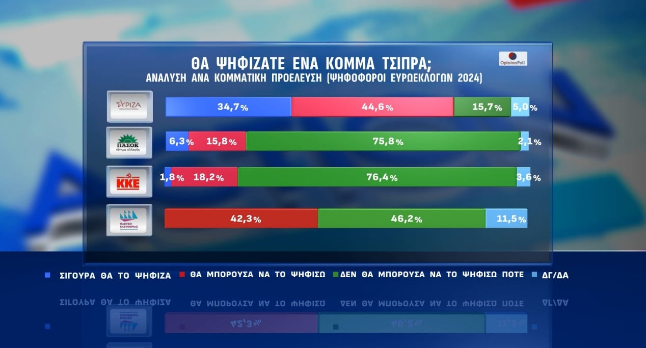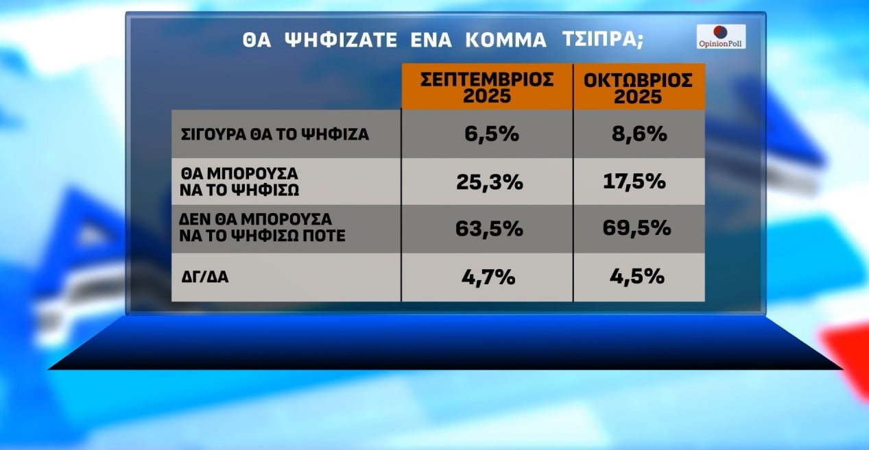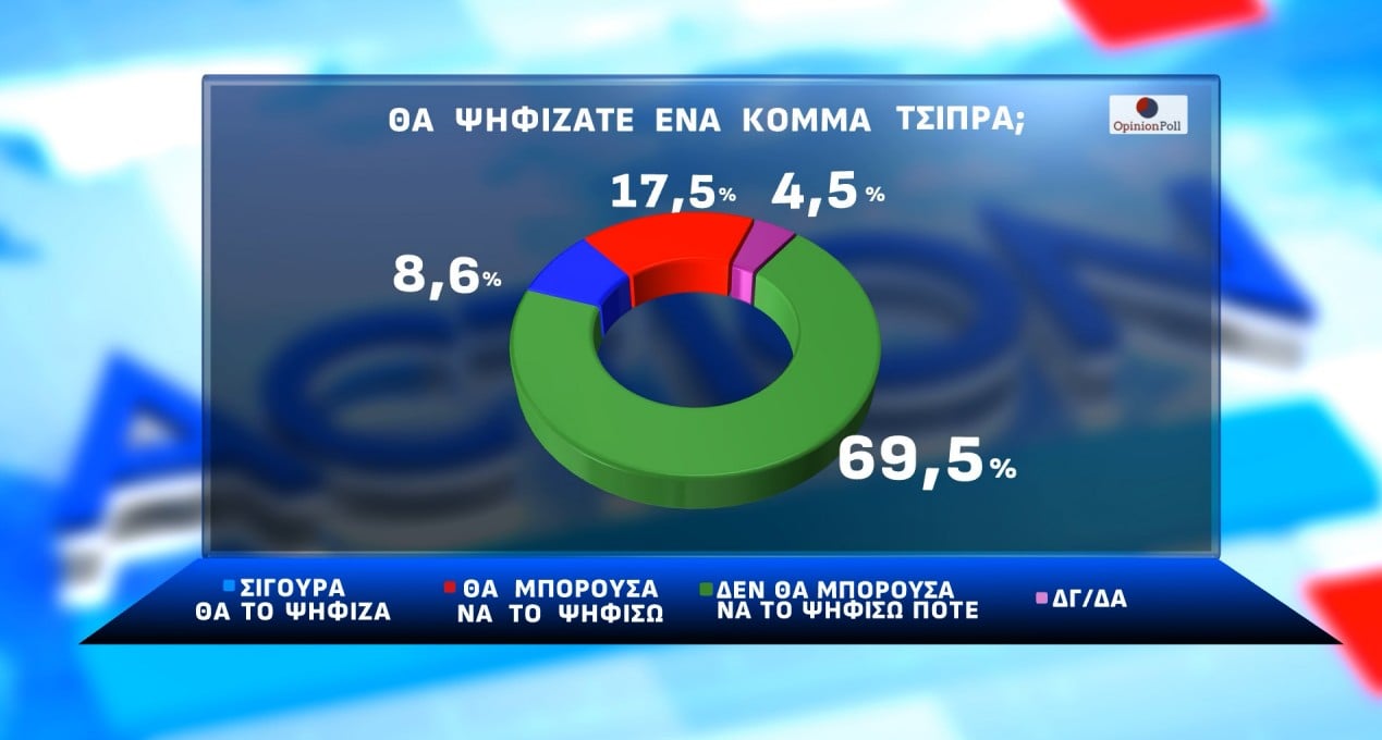 Αναφορικά με το ενδεχόμενο νέου κόμματος από τον πρώην πρωθυπουργό Αλέξη Τσίπρα και πόσοι θα το ψήφιζα, το 8,6% δηλώνει ότι «θα το ψήφιζε σίγουρα», το 17,5% «θα μπορούσε να το ψηφίσει», ενώ το 69,5% λέει ότι «δεν θα μπορούσε να το ψηφίσει ποτέ».