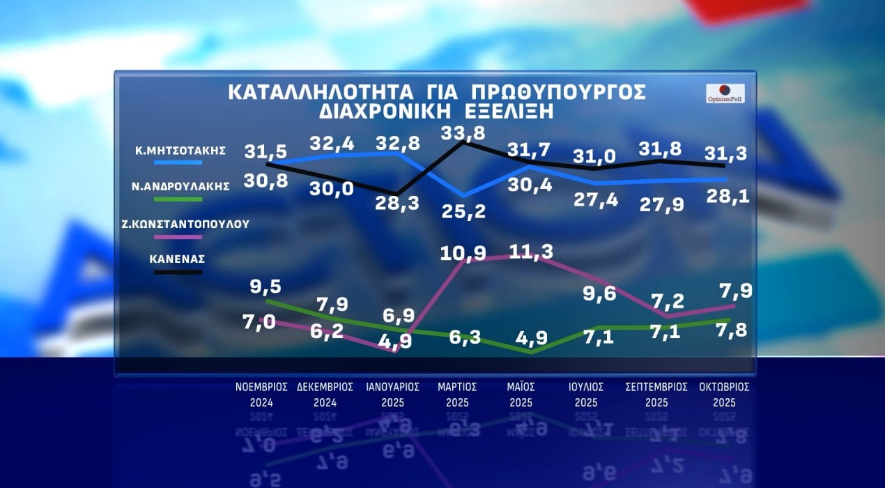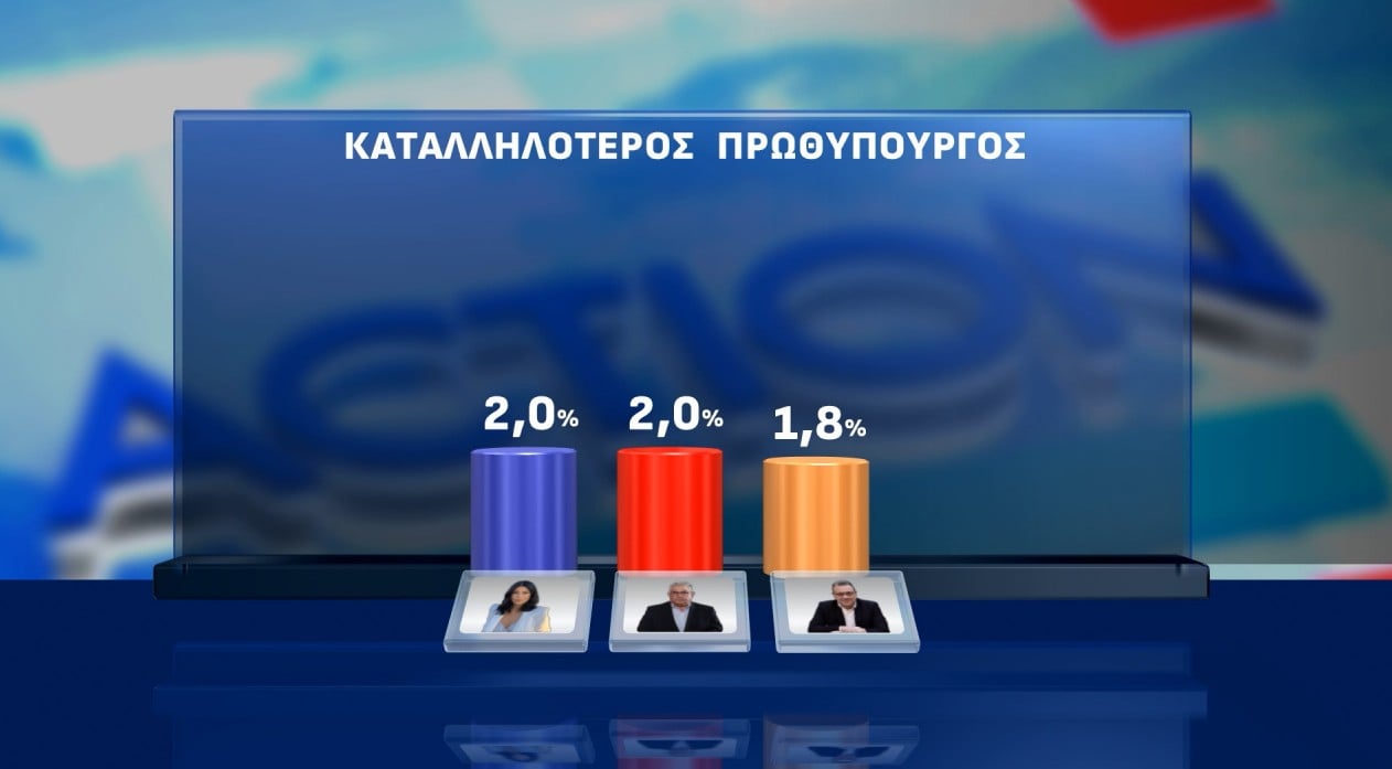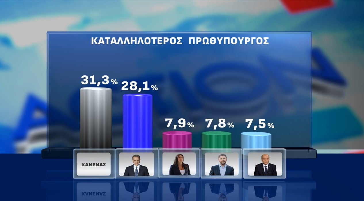 Στο ερώτημα ποιος είναι καταλληλότερος για Πρωθυπουργός, ο «Κανένας» είναι στο 31,3%, ο Κ. Μητσοτάκης στο 28,1%, η Ζ. Κωνσταντοπούλου 7,9%, ο Ν. Ανδρουλάκης 7,8%, ο Κ.Βελόπουλος 7,5%, η Αφρ.Λατινοπούλου 2%, ο Δ. Κουτσούμπας 2%, ο Σ. Φάμελλος 1,8%.