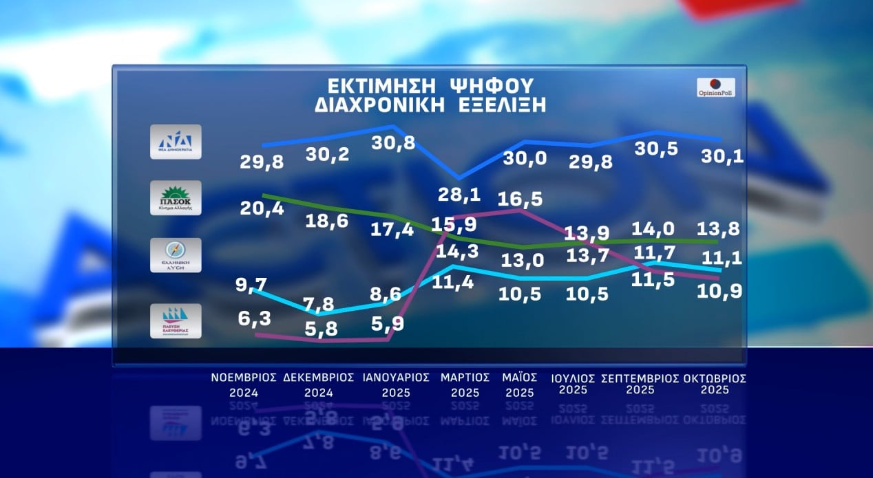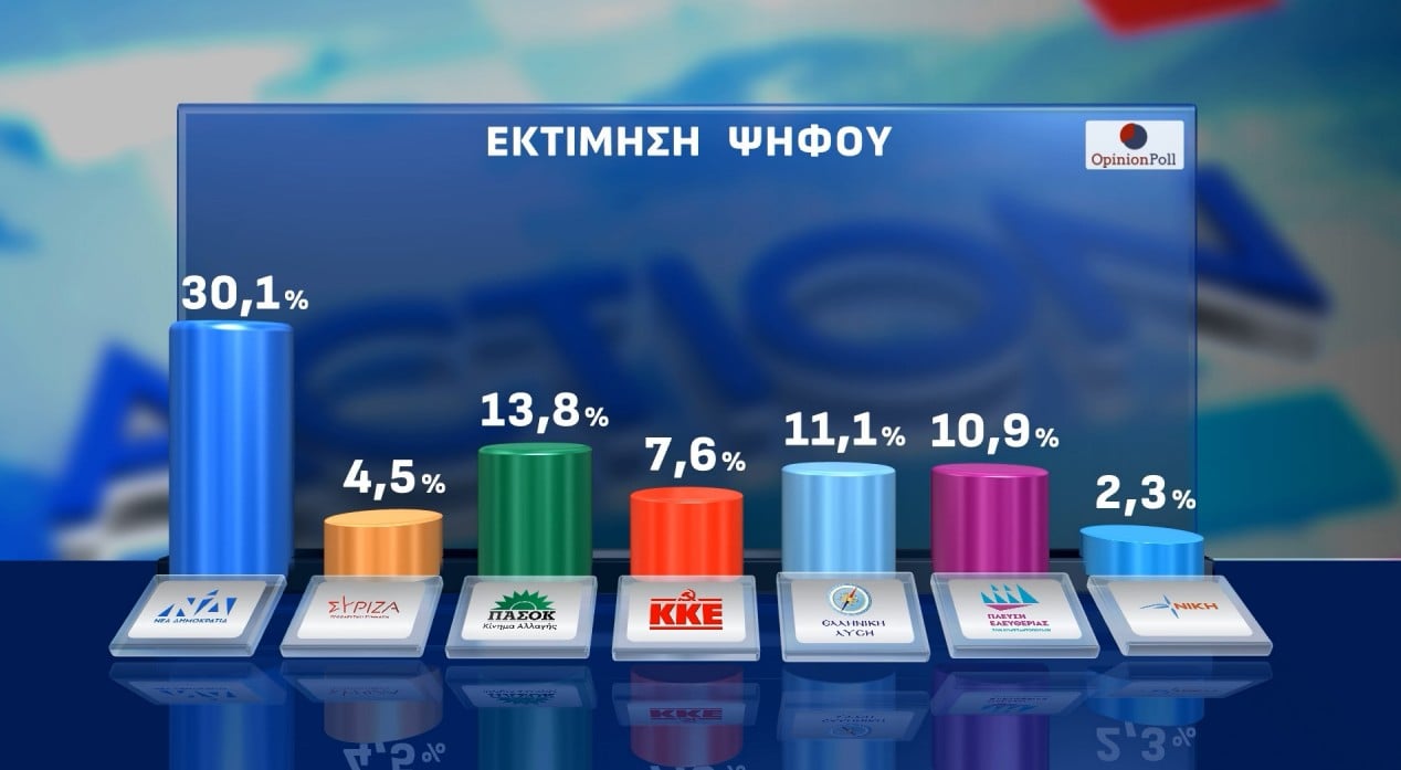 Στην εκτίμηση ψήφου, η ΝΔ είναι στο 30,1%, το ΠΑΣΟΚ 13,8%, η Ελληνική Λύση 11,1%, η Πλεύση Ελευθερίας 10,9%, το ΚΚΕ 7,6%, ο ΣΥΡΙΖΑ 4,5%, η Φωνή Λογικής 4,5%, το ΜέΡΑ25 3,2%, το Κίνημα Δημοκρατίας 2,6%, η Νίκη 2,3%, η Νέα Αριστερά 1,2%, Άλλο κόμμα επιλέγει το 8,2%.