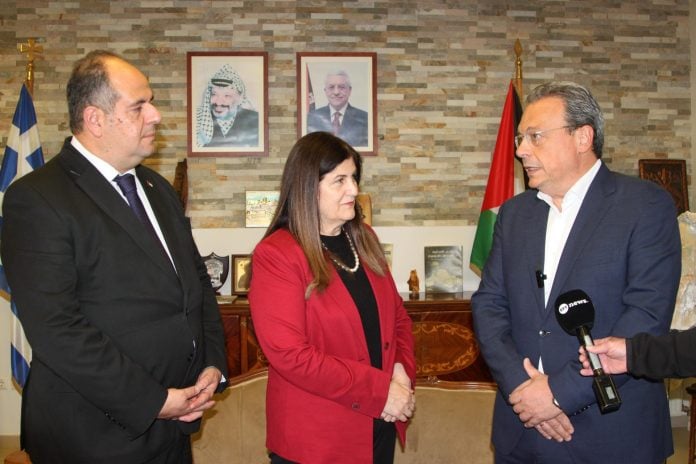 Σωκράτης Φάμελλος: «Είναι μεγάλη χαρά και τιμή που υποδεχόμαστε στην Ελλάδα, εδώ στην Πρεσβεία της Παλαιστίνης, την υπουργό Εξωτερικών και Αποδήμων, Dr. Varsen Aghabekian Shahin, με την οποία είχα τη χαρά και την τιμή να βρεθώ και στη Ραμάλα, στην Παλαιστίνη, όταν μας υποδέχτηκε στο υπουργείο πριν από τέσσερις μήνες.