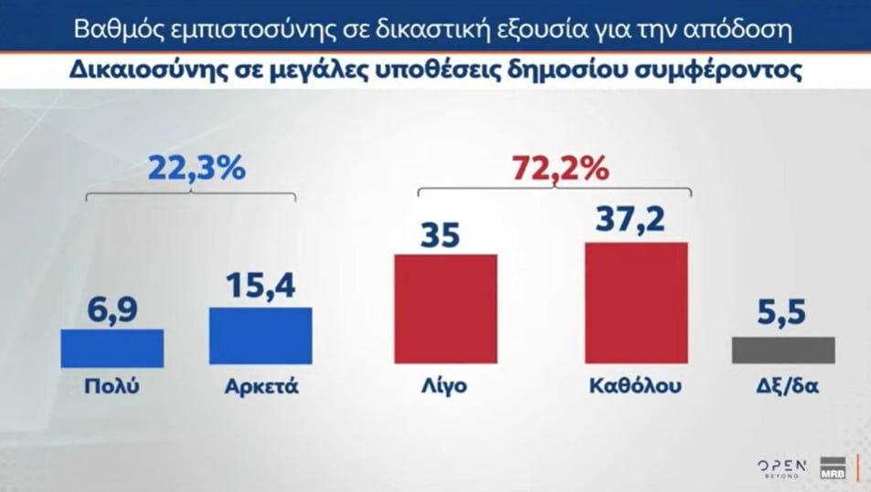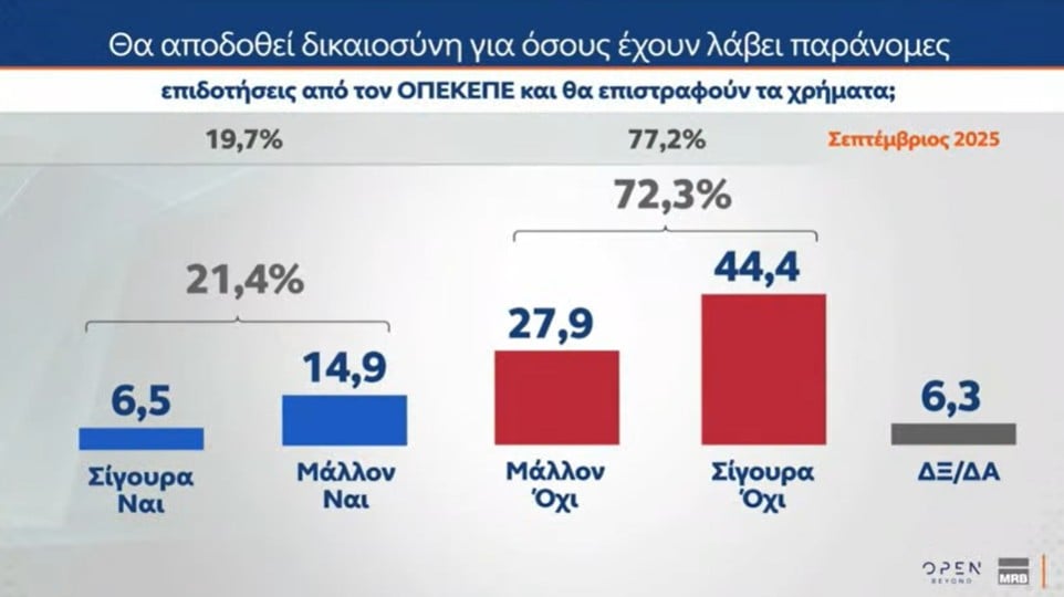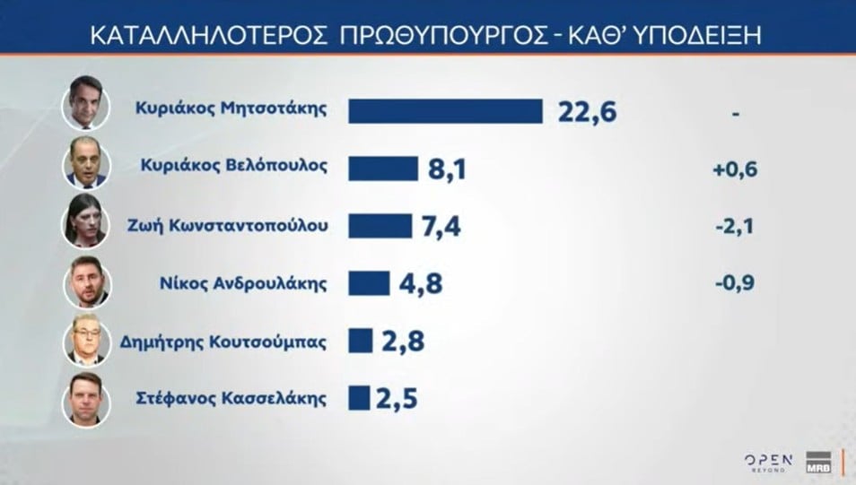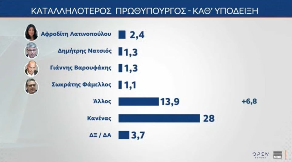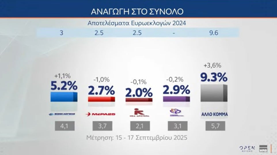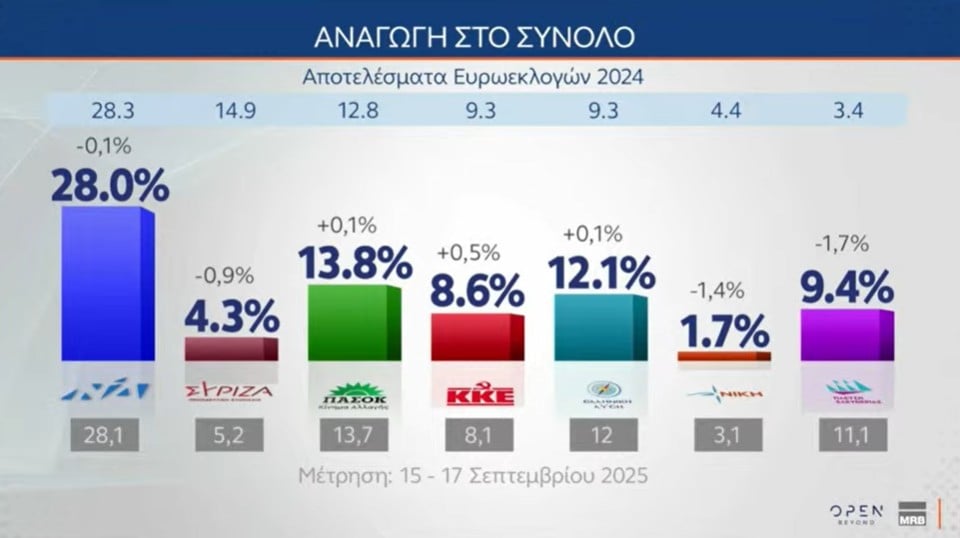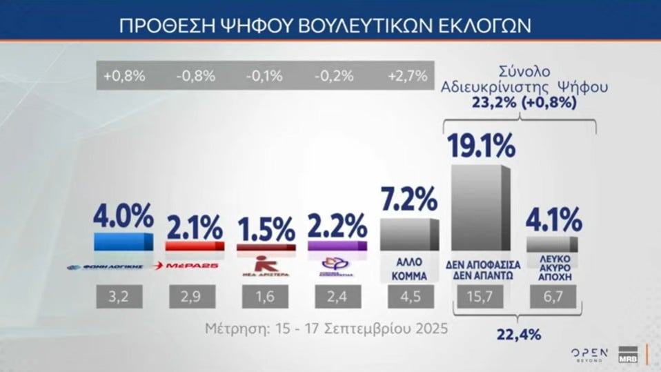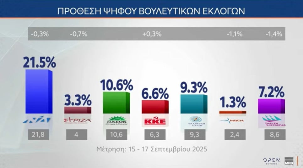 Σύμφωνα με την έρευνα της MRB, για λογαριασμό του OPEN, στην πρόθεση ψήφου η ΝΔ είναι στο 21,5%, το ΠΑΣΟΚ 10,6%, η Ελληνική Λύση 9,3%, η Πλεύση Ελευθερίας 7,2%, το ΚΚΕ 6,6%, η Φωνή Λογικής 4%, ο ΣΥΡΙΖΑ 3,3%, το Κίνημα Δημοκρατίας 2,2%, το ΜέΡΑ25 2,1%, η Νέα Αριστερά 1,5%, η Νίκη 1,3%, Άλλο Κόμμα 7,2%, ενώ το σύνολο της αδιευκρίνιστης ψήφου είναι στο 23,2%.
