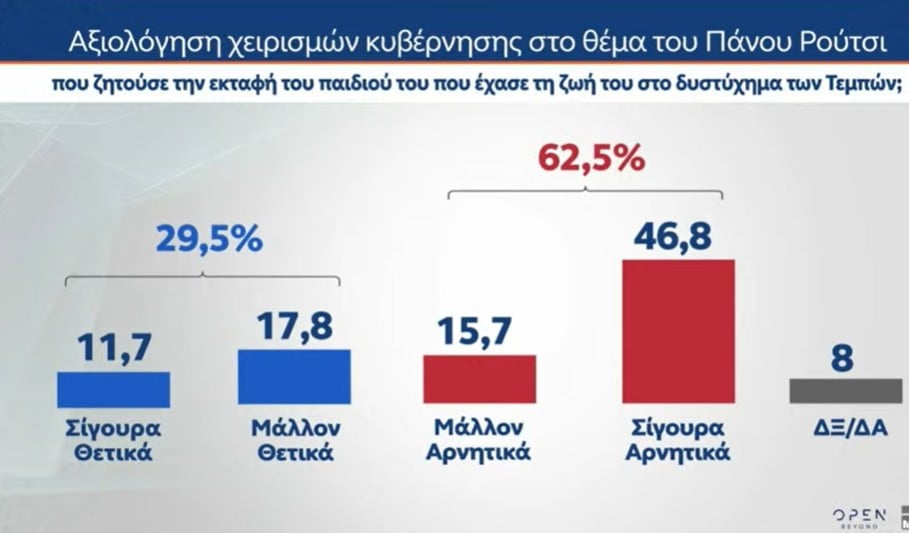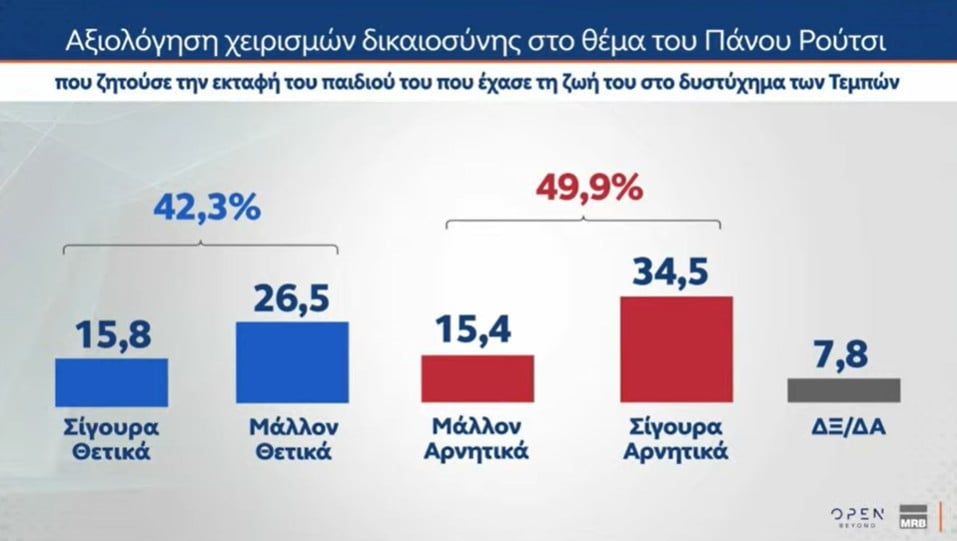 Την αξιολόγηση των πολιτών για τους χειρισμούς της κυβέρνησης απέναντι στο αίτημα Ρούτσι αλλά και την πρόταση για τον χώρο του μνημείου του Αγνώστου Στρατιώτη καταγράφει η νέα δημοσκόπηση της MRB, ενώ ενδιαφέρον παρουσιάζουν τα ευρήματα τόσο για τωρινά κόμματα όσο και με τα ενδεχόμενα κόμματα Τσίπρα, Σαμαρά και Καρυστιανού.