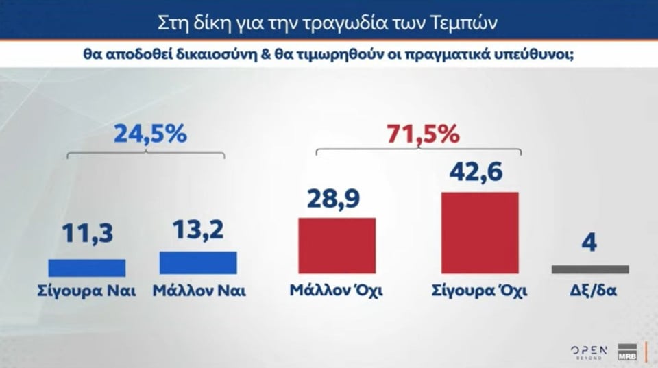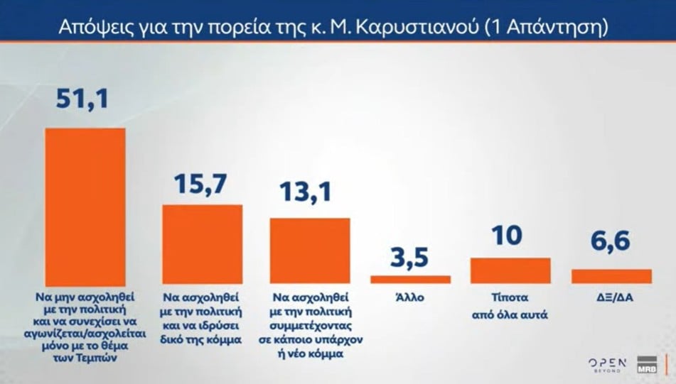 Με το 51,1% να εκφράζει την άποψη η κυρία Καρυστιανού να μην ασχοληθεί με την πολιτική και να συνεχίσει να αγωνίζεται/ ασχολείται μόνο με το θέμα των Τεμπών.