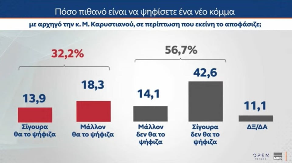 Μάλιστα, σύμφωνα με τη δημοσκόπηση της MRB, το 32,2% απαντά ότι «σίγουρα/μάλλον» θα ψηφίζε ένα νέο κόμμα με αρχηγό την Μαρία Καρυστιανού.