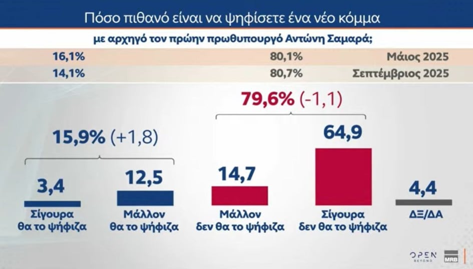 Σε αντίστοιχο ερώτημα, το 15,9% δηλώνει ότι «σίγουρα/μάλλον» θα ψήφιζε ένα νέο κόμμα από τον πρώην πρωθυπουργό Αντώνη Σαμαρά.