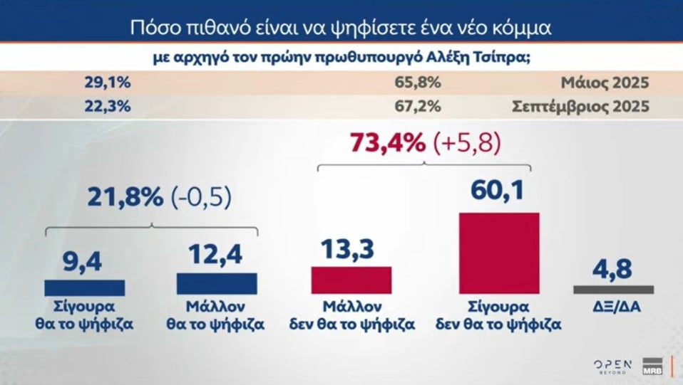 Ενώ σε ερώτηση για το πόσο πιθανό είναι να ψήφισε ένα νέο κόμμα με αρχηγό τον κ. Τσίπρα, το 21,8% απαντά πως «σίγουρα/μάλλον» θα το ψήφιζε.