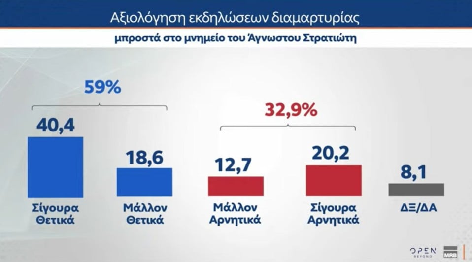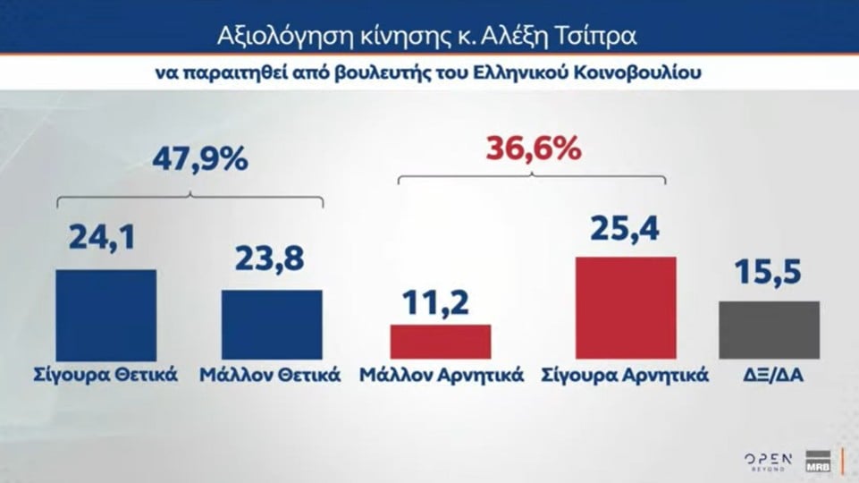 Σε ερώτημα πώς αξιολογούν την κίνηση του πρώην πρωθυπουργού, Αλέξη Τσίπρα, να παραιτηθεί από βουλευτής, το 47,9% την αξιολογεί «σίγουρα θετικά/μάλλον θετικά».